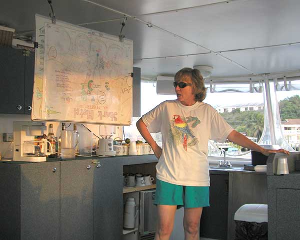 The boat crew was great at organizing shipboard fun. We had silly games, a funny slideshow of pictures made by the crew while divers were underwater, and a hilarious fashion show. On the last night aboard, I dived into the deep end (so to speak), using my acting experience to spoof Captain Alan's deadpan dive briefings, complete with his South African accent and ubiquitous sunglasses. The audience seemed receptive.