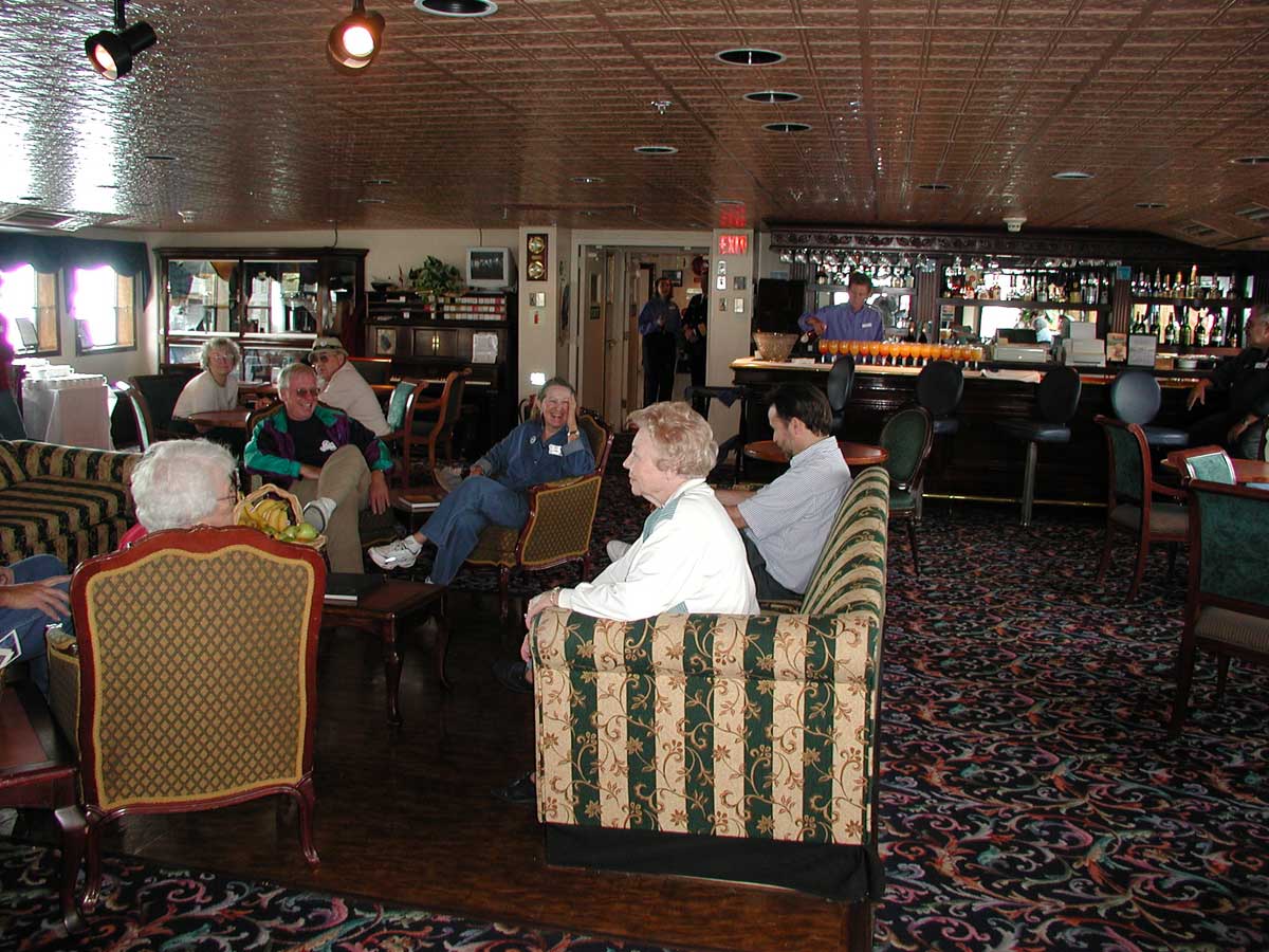 We make our way upstairs to the lounge for an embarkation orientation and, more importantly, a free bon-voyage cocktail. The lounge is a pleasant old-fashioned room furnished with cocktail tables, overstuffed chairs and sofas, a gleaming bar, and a player piano. We strike up conversations with fellow passengers; one of our first meetings is with a couple from a small town in Texas! Marian won't need to worry about having the only southern accent on board.