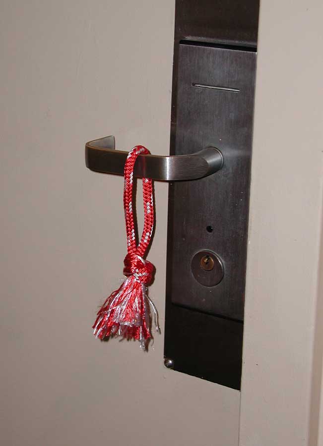 "The knock-knock-knot is not only nautical, it’s a notice to the crew not to knock. So if you’re nodding off, put your knock-knock-knot on the knob and we won’t come a-knocking. But if you’re not napping and your knock-knock-knot is on the knob, you’re gonna get service - NOT - cause we’re not napping. So if you were naughty and your knock-knock-knot was on the knob when you were not napping, come up to a crew member and say, 'I’m sorry I was naughty but my knock-knock-knot was on the knob when I was not napping and now my nook is not neat'; and now a crew member will neaten your nook nicely." (pregnant pause for applause)