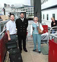Crew members meet us as we board; the red-carpet treatment begins immediately. We are escorted to our cabins, which are on the lower deck at the bow (that's front of ship, you landlubbers). Our luggage has already been delivered! Marian's cabin, presumably a double, is quite snug even for one. Our cabin has plenty of space - we have paid extra for the privilege - but our position at the bow gives the floor a 5-degree uphill slope. The head (bathroom) has a six-inch floor lip for tripping over, and the wall around the toilet is sprouting significant rust spots. Ah well, we came for the sights, right?