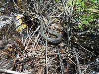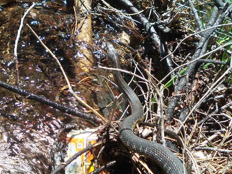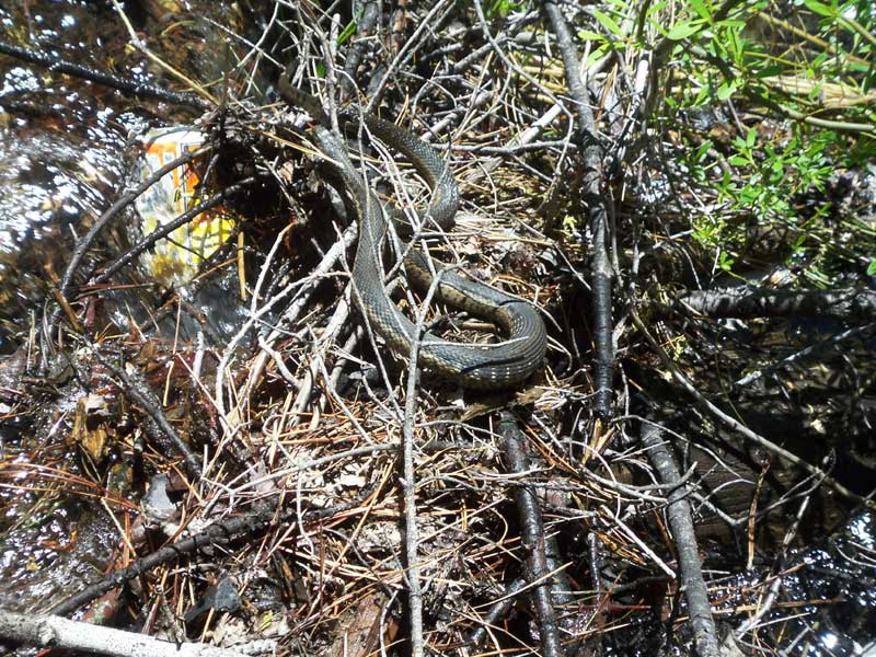 These clear, icy waters originate in high Sierra lakes and recklessly plunge thousands of feet to feed the American River below. While admiring the rushing river, we disturbed a slinky fellow napping in the sun.
