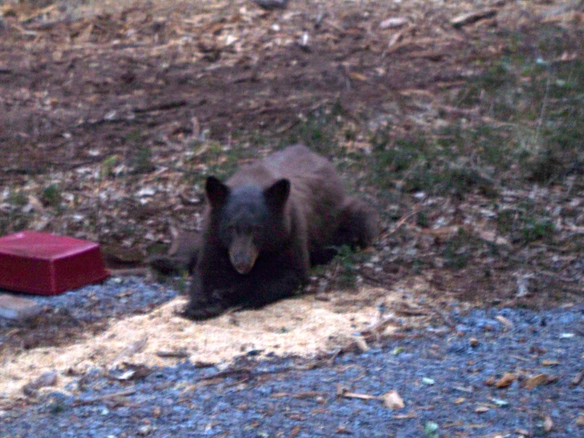 I tiptoed to the back windows of the trailer just in time to see a fat black bear munching on the big pile of deer food he'd dumped from our plastic dishpan feeder. Mike managed to snap one fuzzy, dark-thirty picture as Mr. Bear looked up and saw us. He took off as if shot out of a cannon -- who knew such a chubby waddler could move so fast!